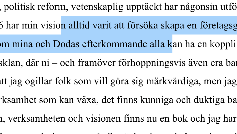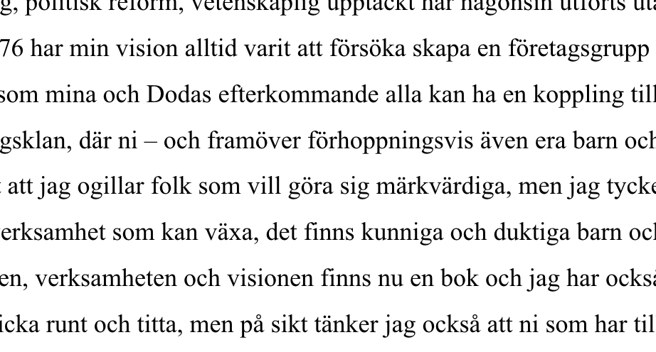 Det jag har sett framför mig är en företagsklan, där ni – och framöver förhoppningsvis även era barn och barnbarn – är med och driver, leder och utvecklar verksamheten. Ni vet att jag ogillar folk som vill göra sig märkvärdiga, men jag tycker ändå att det har blivit rätt bra.